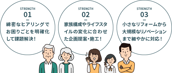 大小問わず、皆さまの要望に応じて毎日の暮らしを心地よく変えるリフォームを提案します。
